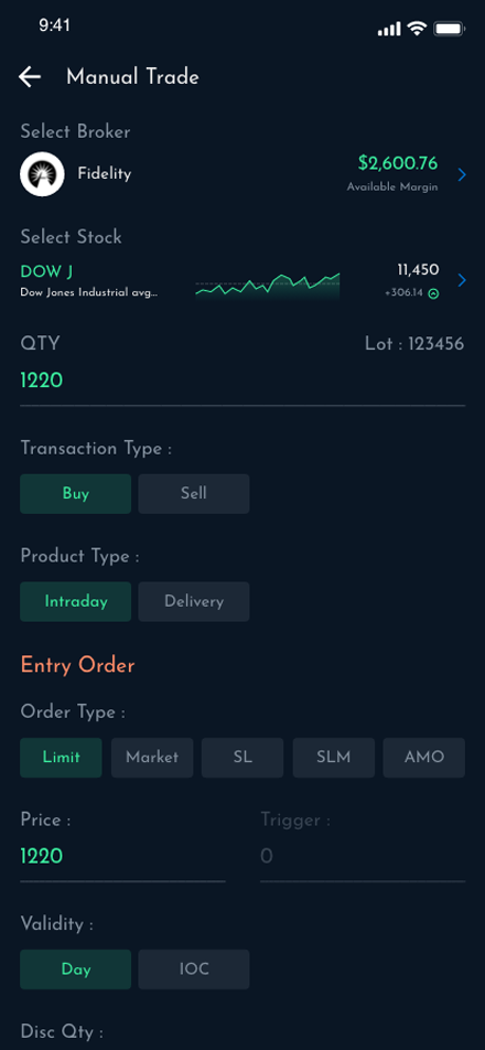 Automatically enter and exist market with stocks of your choice by setting your "Entry Order & Exist Order" while placing the order.