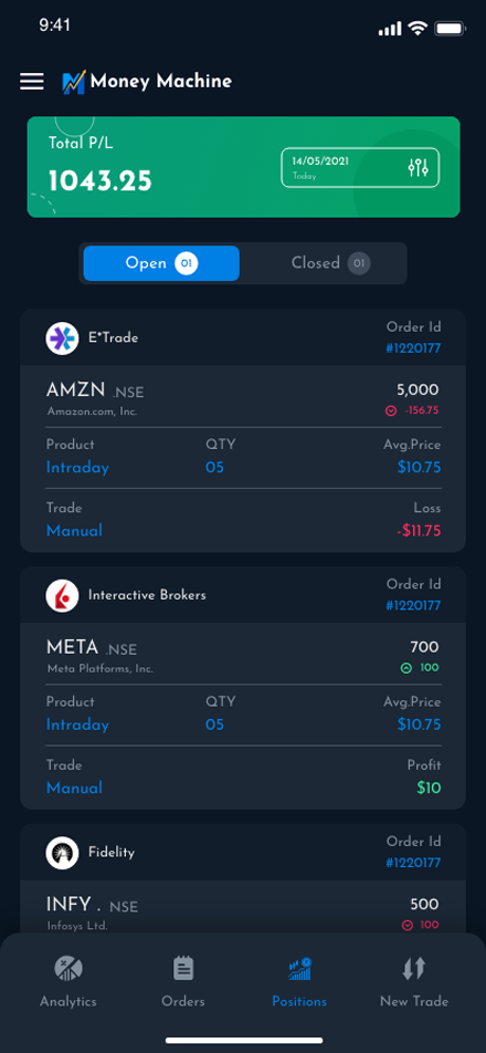 Get the instant status of your orders and overall profit/loss accrued in the selected period of time.